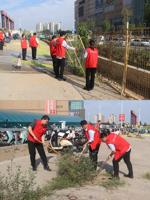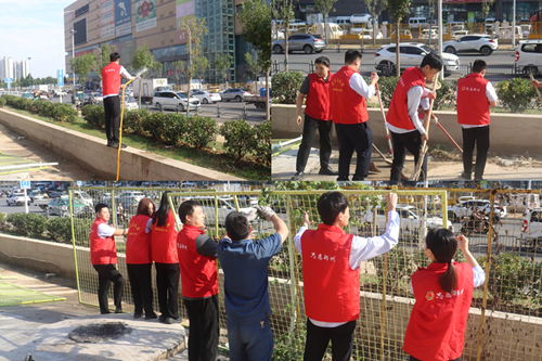 9月24日,新商城運營公司黨支部組織開展“環(huán)境衛(wèi)生整治”主題黨日活動,弘揚“奉獻、友愛、互助、進步”的志愿精神?;顒又?,黨員志愿者身著紅馬甲,協(xié)作拆除商城外圍陳舊圍擋,清理地面雜草垃圾,并拿起水管,給周邊綠化帶中的植物澆水,草叢在灌溉下愈顯生機。