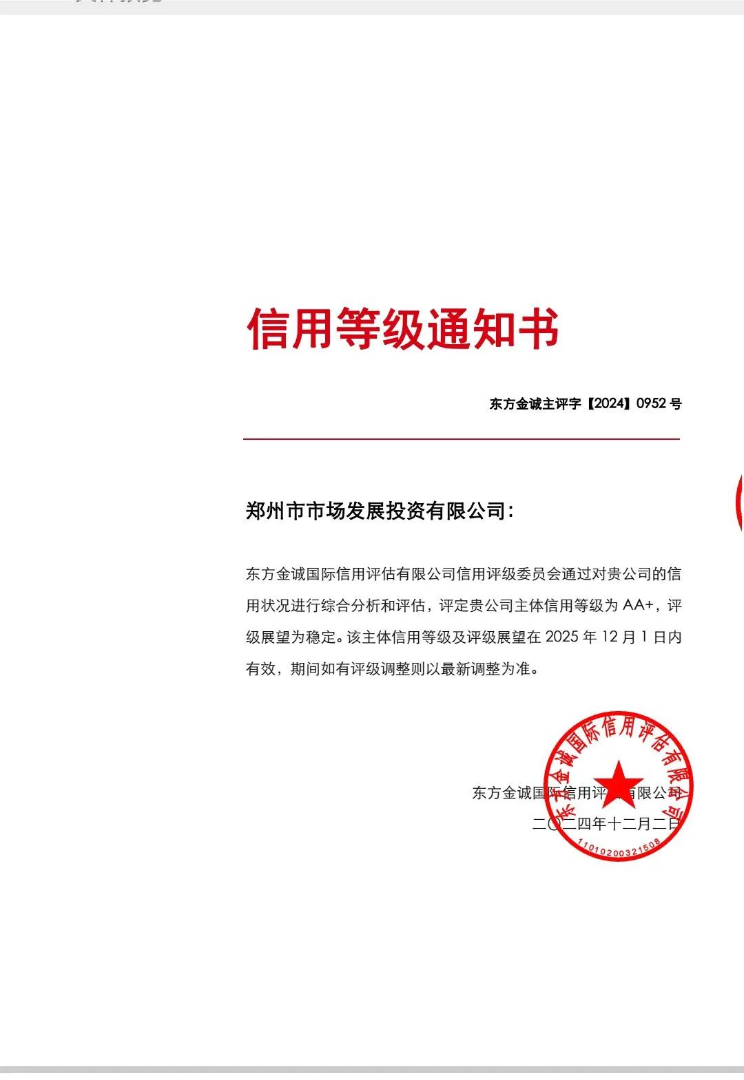 近日,鄭州市市場(chǎng)發(fā)展投資有限公司獲得國(guó)內(nèi)權(quán)威評(píng)級(jí)機(jī)構(gòu)東方金誠(chéng)國(guó)際信用評(píng)估有限公司AA+主體信用評(píng)級(jí),評(píng)級(jí)展望為“穩(wěn)定”。